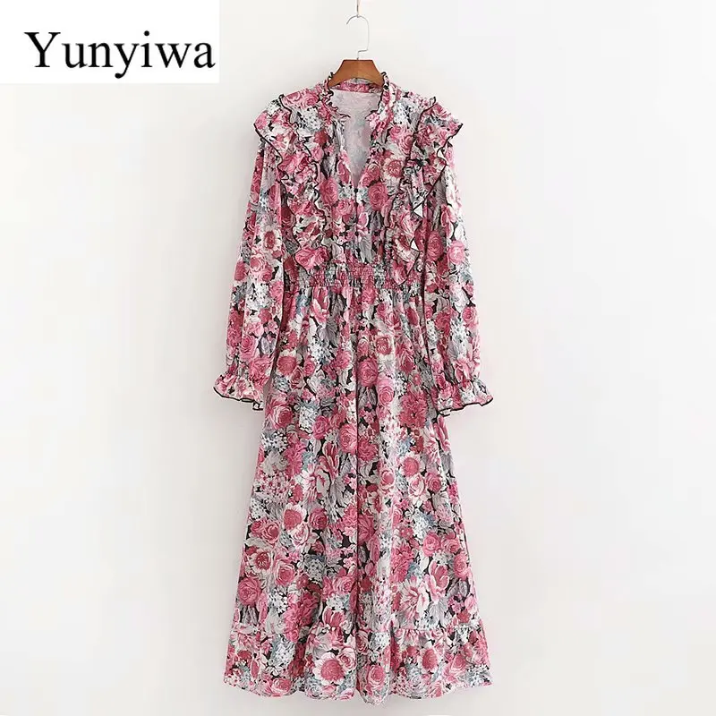 Женское платье с длинным рукавом, ламинированное декоративное платье с цветочным принтом, повседневные женские платья, вечерние, длинное, свободное, Элегантное макси платье