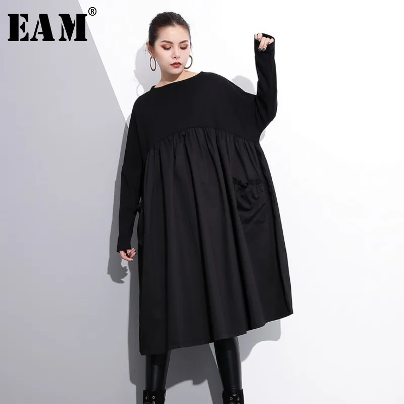 [EAM] 2019 Новинка весны с круглым вырезом и длинными рукавами Черная; большого размера карманов раза Разделение совместное большой Размеры пла...