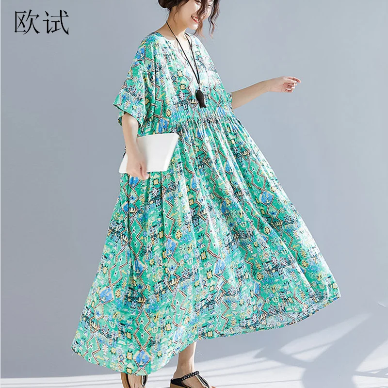 Повседневное свободное хлопковое льняное длинное платье размера плюс, элегантные платья для женщин 4xl 5xl 6xl, богемное летнее зеленое пляжное...