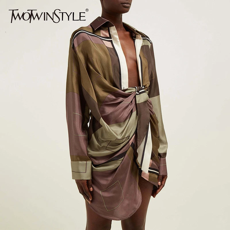 TWOTWINSTYLE платье с геометрическим узором для женщин воротник с лацканами Высокая талия хит цвет женские платья женские 2019 осень Мода Новинка