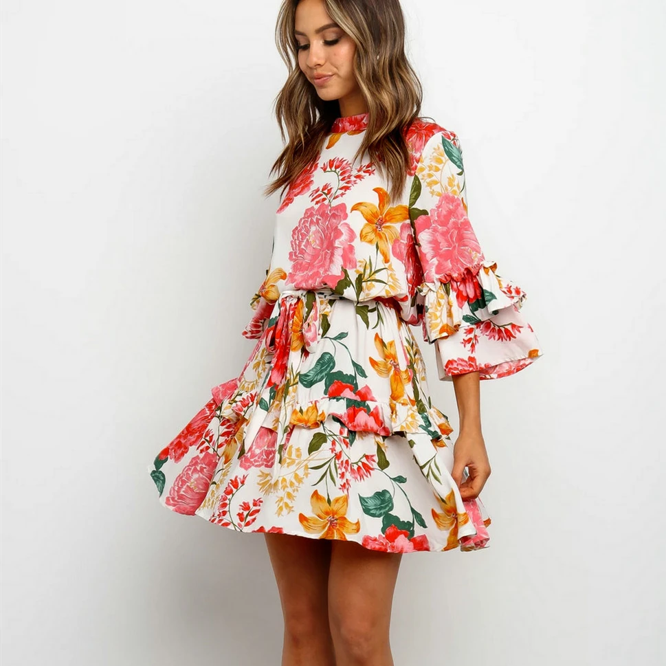 Boho пляжный летний сарафан с цветочным принтом, женское мини-платье с длинным рукавом и оборками, элегантное дамское вечернее Клубное платье для девушек