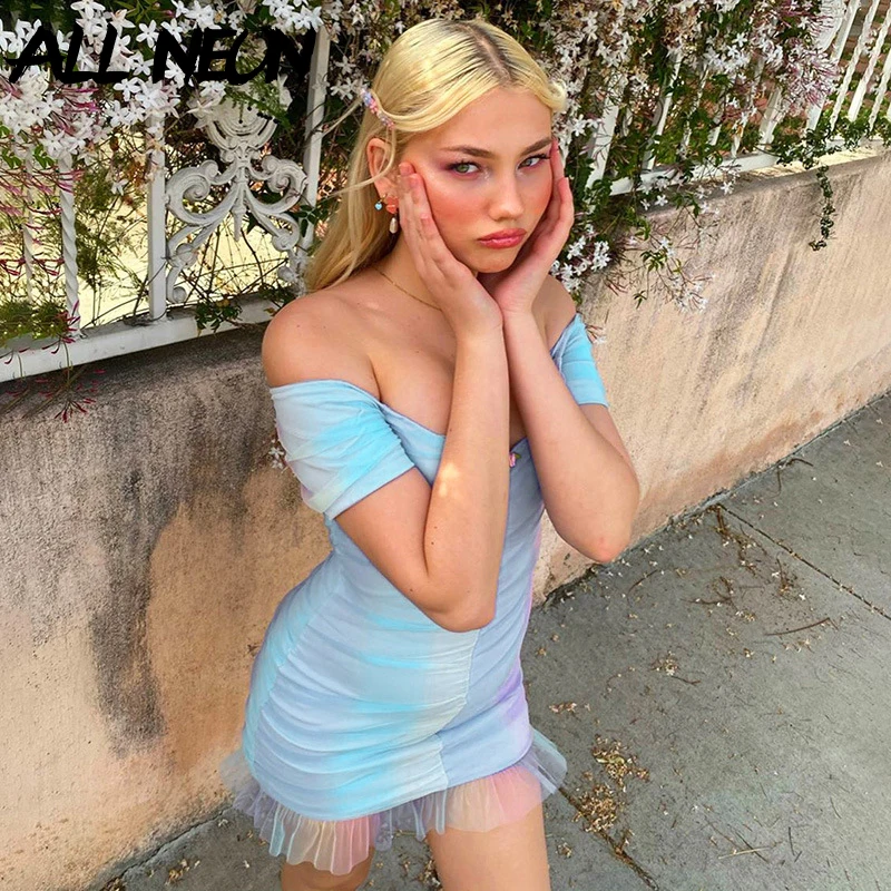 ALLNeon/милые яркие вечерние платья с открытыми плечами и рюшами модное Сетчатое облегающее мини-платье с короткими рукавами для девочек; Винтажное летнее платье