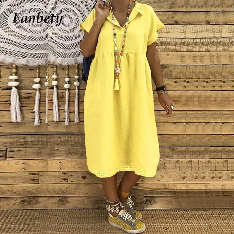 Fanbety, однотонное свободное льняное платье, женское летнее платье-футболка с отложным воротником, женское модное платье с коротким рукавом, м...