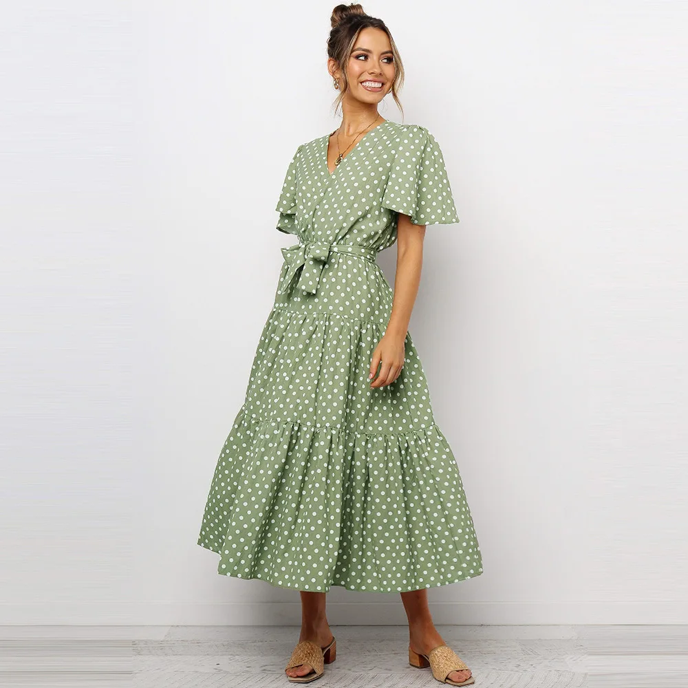 Женское платье в горошек с рукавом-бабочкой, офисное платье до середины икры со шнуровкой и треугольным вырезом, 2020