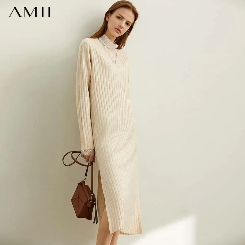 [Зимняя распродажа для фестиваля] Amii минимальное французское платье феи для женщин 2019 Осень Новый v-образный вырез Сплит яма свитер юбка