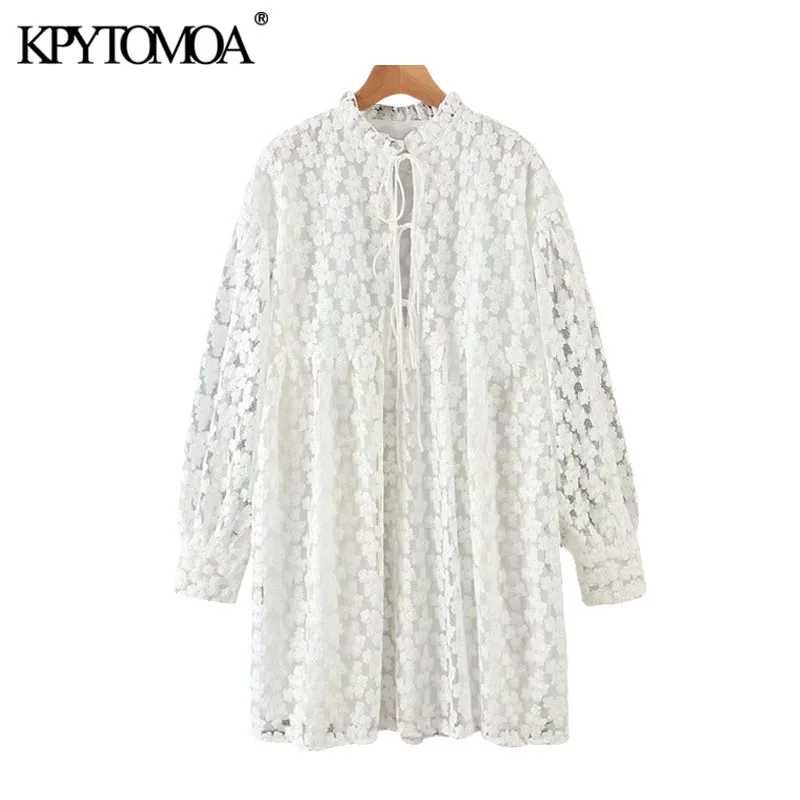 KPYTOMOA женское мини-платье с вышивкой и бантиками, винтажное Прозрачное платье с высоким воротом, пышные рукава, женские платья, 2020