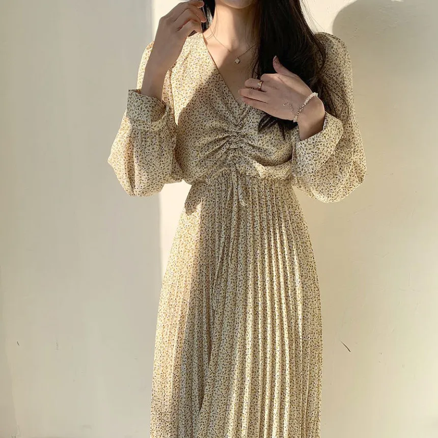 HziriP Новое весеннее летнее элегантное женское платье с v-образным вырезом и длинным рукавом с цветочным принтом плиссированное платье женские шифоновые вечерние платья с высокой талией