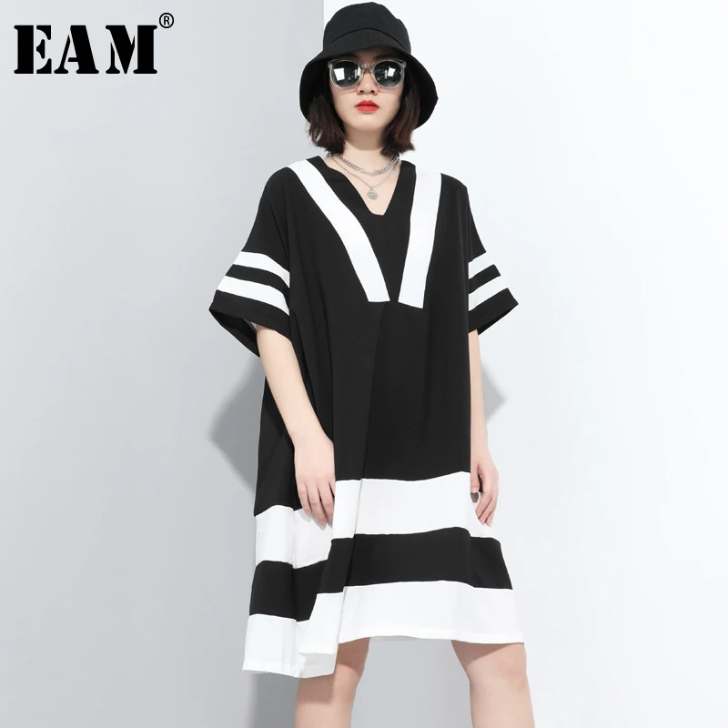 Женское платье в полоску EAM, черное платье большого размера с треугольным вырезом и коротким рукавом, модель 1T882 на весну-лето 2020