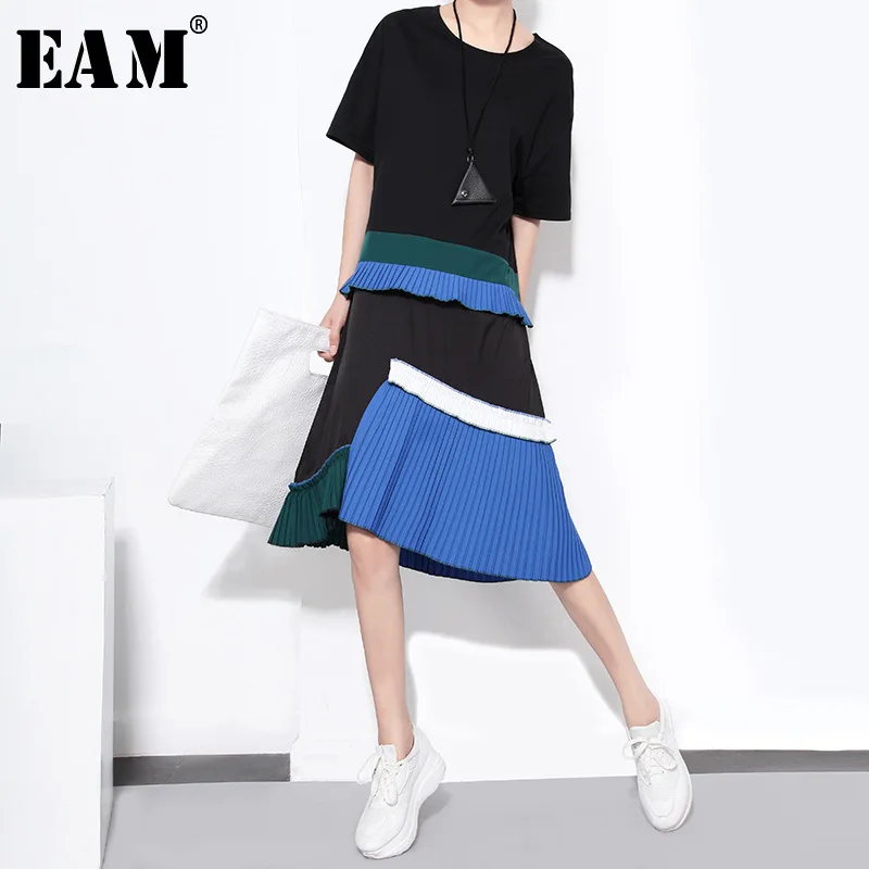 [EAM] 2019 Новый сезон: весна–лето шею короткий рукав хит Цвет плиссированные нерегулярные стежка свободное платье Для женщин моды прилив JR573