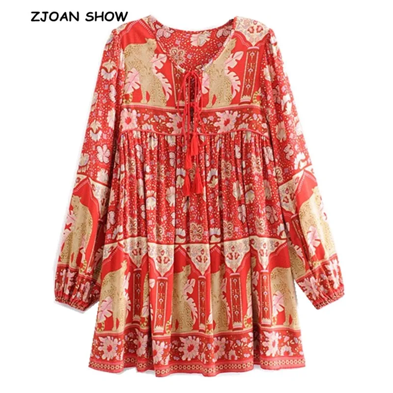 2019 богемное кружевное платье с v-образным вырезом и цветочным принтом в стиле бохо красное летнее этническое женское повседневное мини-плат...