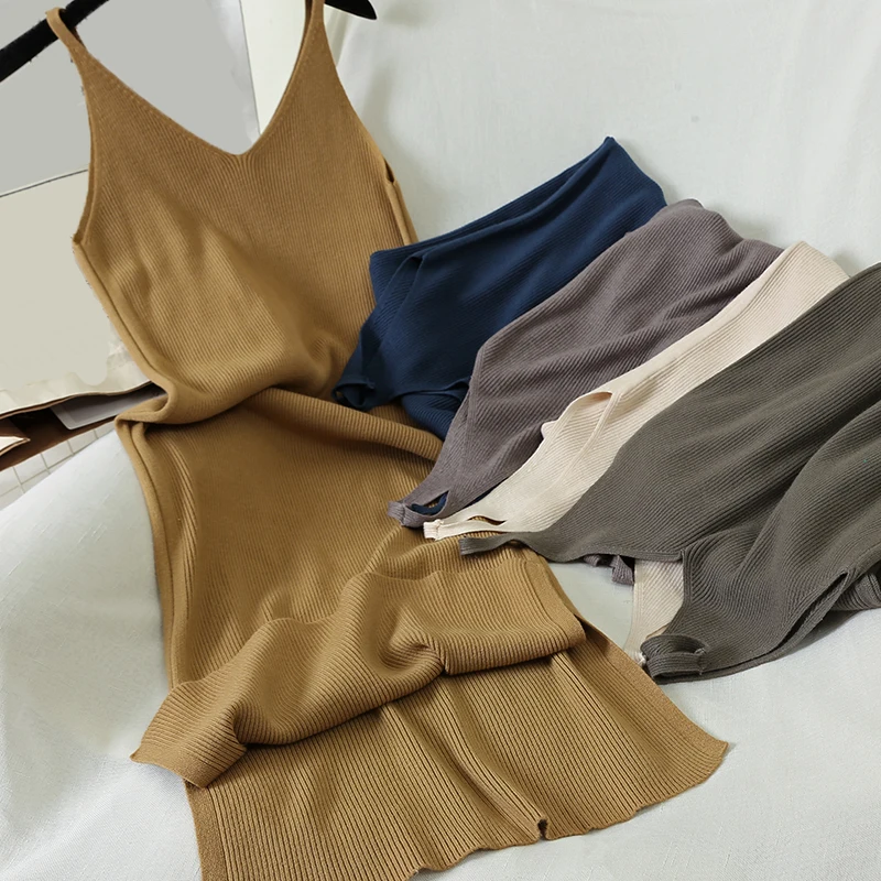 Повседневное корейское женское однотонное ТРАПЕЦИЕВИДНОЕ трикотажное платье на осень и зиму в винтажном стиле с v-образным вырезом элегант...