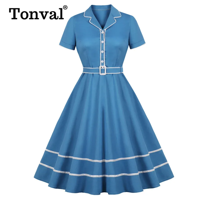 Tonval Элегантное синее однотонное платье на пуговицах с контрастной лентой по подолу женское винтажное платье С Вырезанным воротником хлопк...