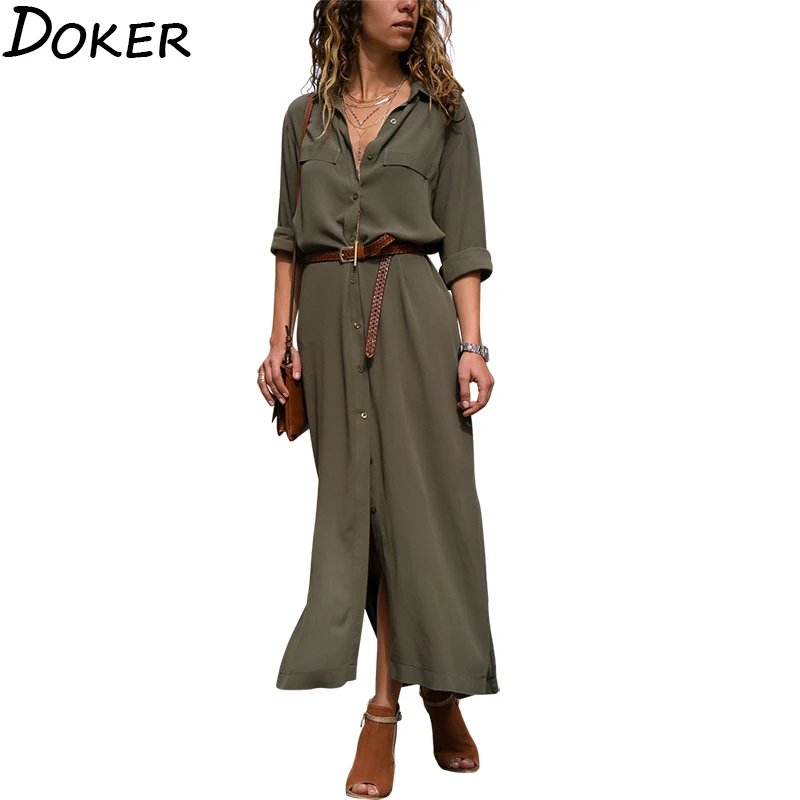 Женское офисное платье-рубашка, длинное платье средней длины с длинным рукавом и отложным воротником в стиле бохо, элегантные вечерние платья, весна-лето 2020