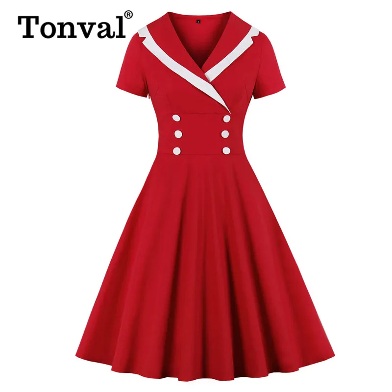 Tonval, Ретро стиль, зазубренный воротник, пуговица спереди, элегантное красное винтажное ТРАПЕЦИЕВИДНОЕ платье для женщин, хлопок, летнее, офи...