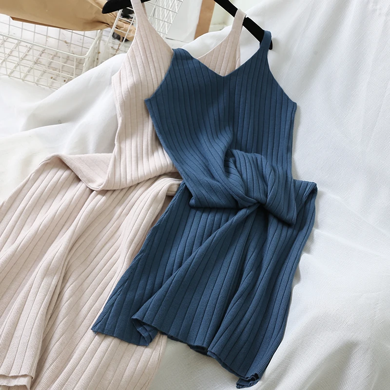 Повседневное корейское женское однотонное платье трапециевидной формы в стиле ампир, осеннее платье на тонких бретелях с v-образным вырезом, элегантные женские платья до середины икры Vestidos