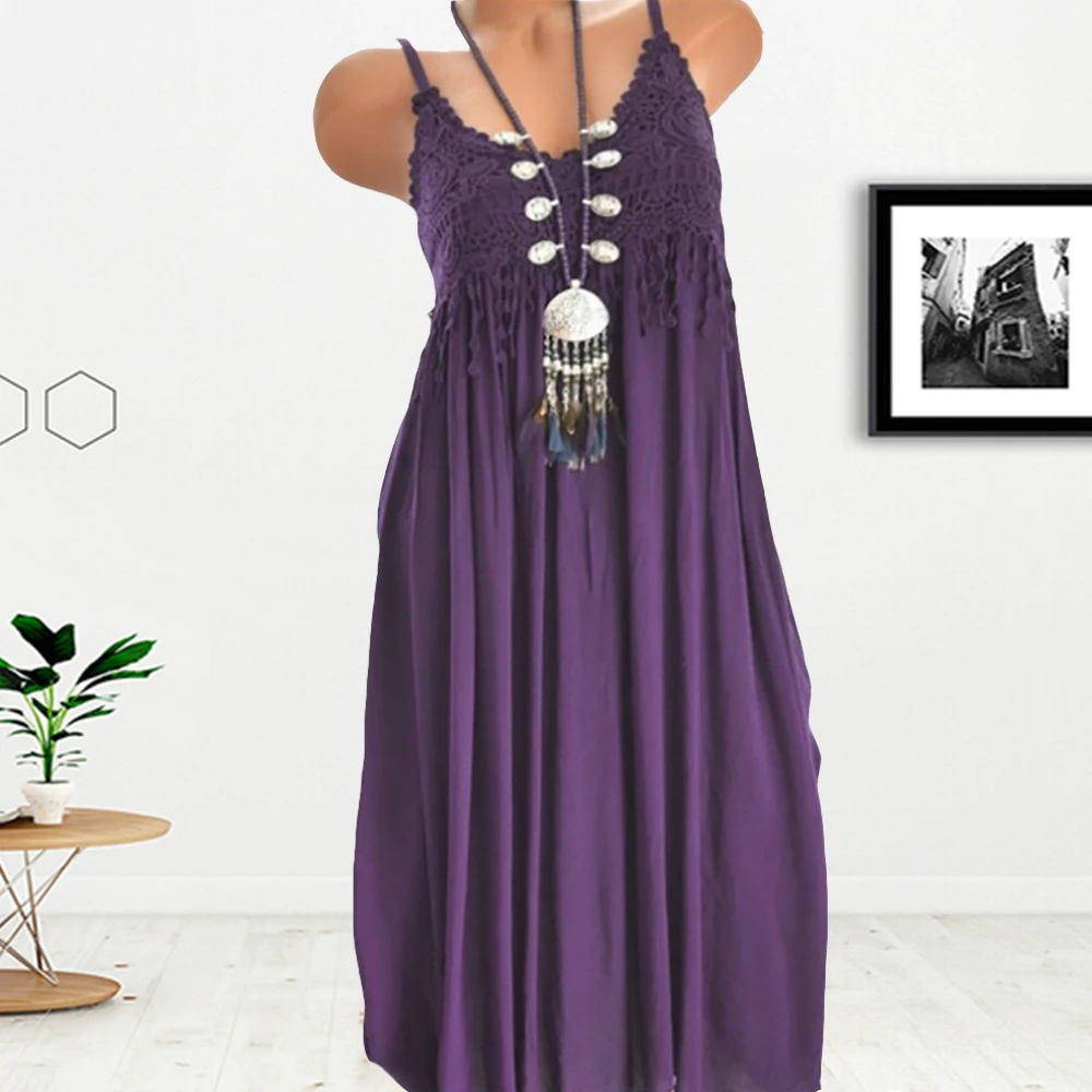 Плюс размер женское Макси длинное платье модное без рукавов вязаное кружевное платье с расклешенными элегантными бретельками 5 цветов