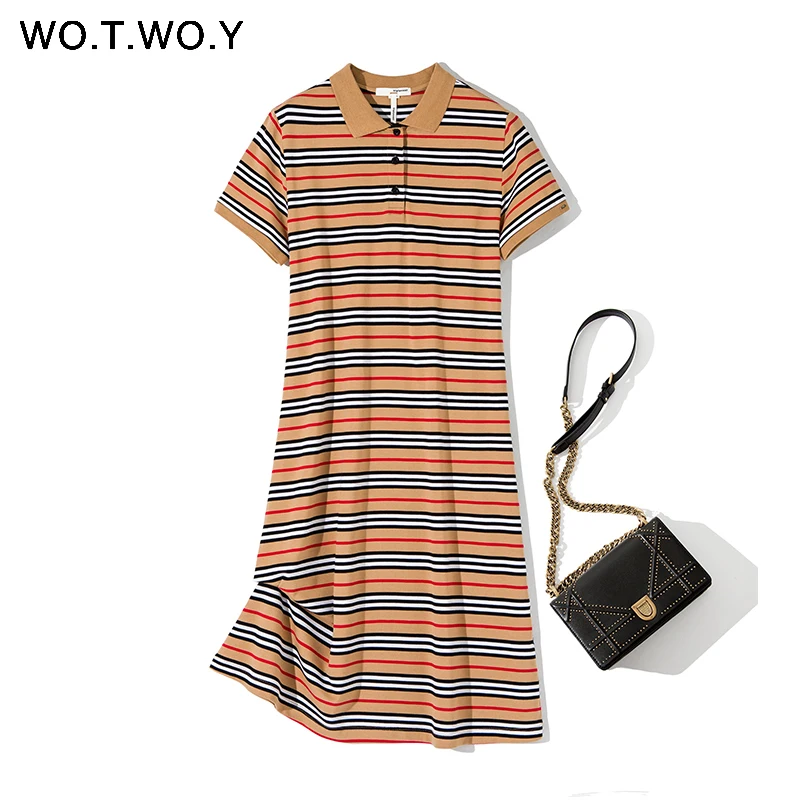 WOTWOY 2020, Модные Полосатые Повседневные платья поло, женские весенне-летние прямые платья с отложным воротником, женская одежда на пуговицах