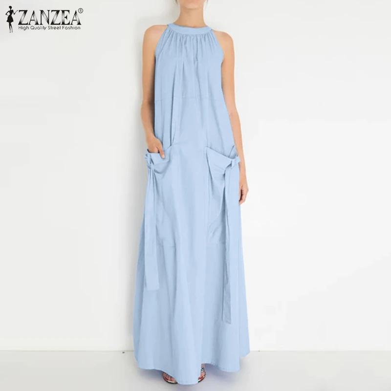 ZANZEA женское длинное платье макси с лямкой на шее 2020 летний сарафан Элегантное платье без рукавов с пуговицами сзади и карманами пляжное платье Femme 7