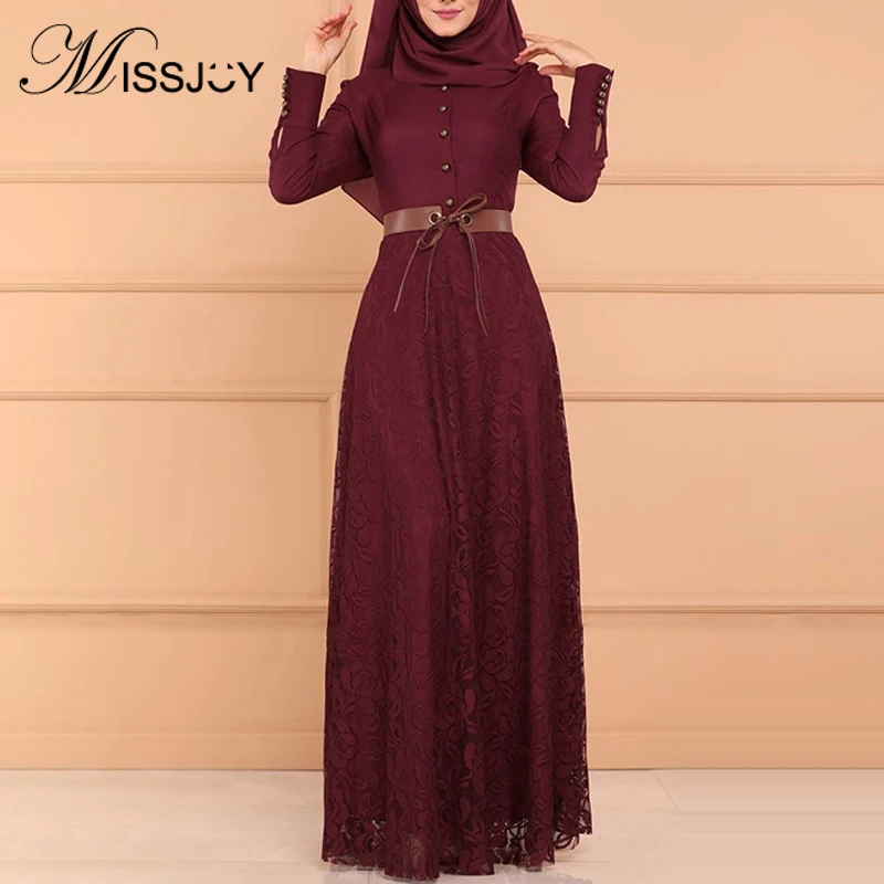 MISSJOY мусульманских сплошной цвет черный старинные кружева халат платье полный рукав свободные Модные ботильоны-Длина платья с ремень