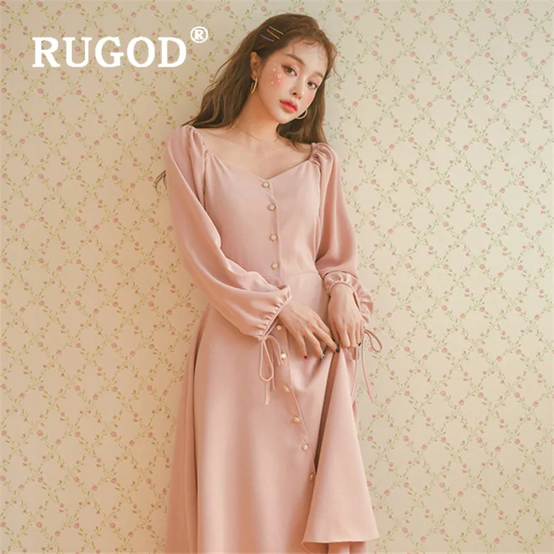 RUGOD Новая мода темперамент шифоновое платье одноцветное розовое однобортное с длинными рукавами Высокая талия свободные макси Vestidos элегантный