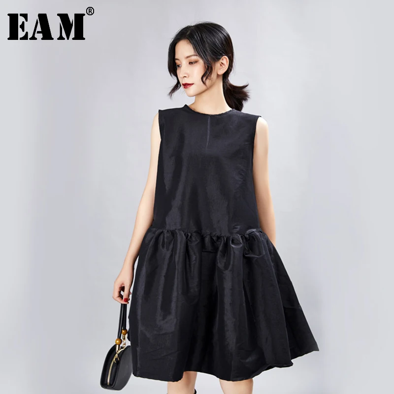 Женское платье с оборками EAM, черное Свободное платье с круглым вырезом и длинными рукавами, весна-лето 2020, JX337
