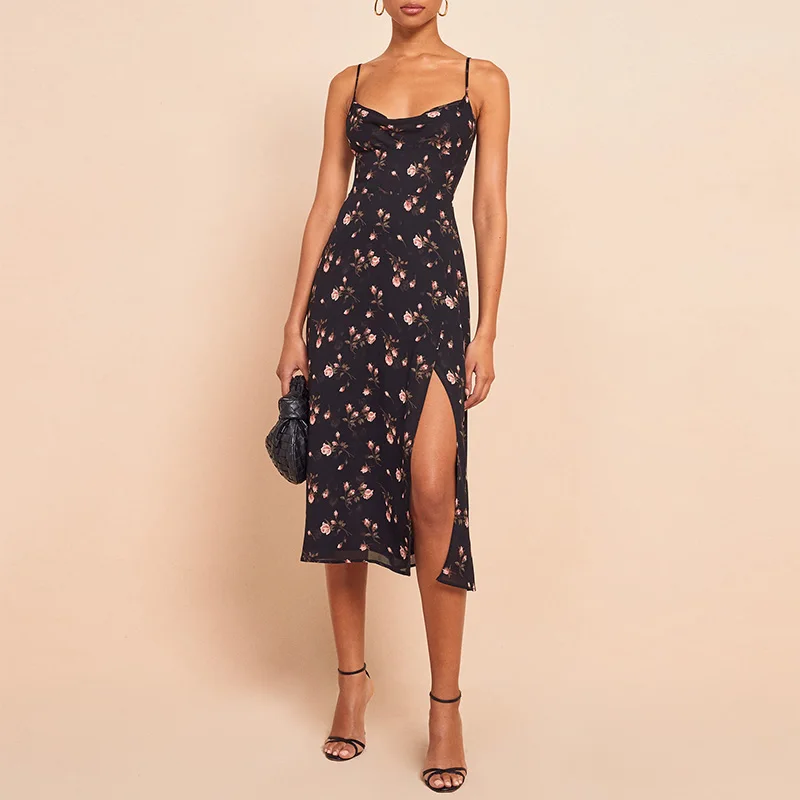 Летнее платье 2020, винтажное женское платье с цветочным принтом, шифоновое элегантное платье миди на бретельках, сексуальные пляжные платья для женщин