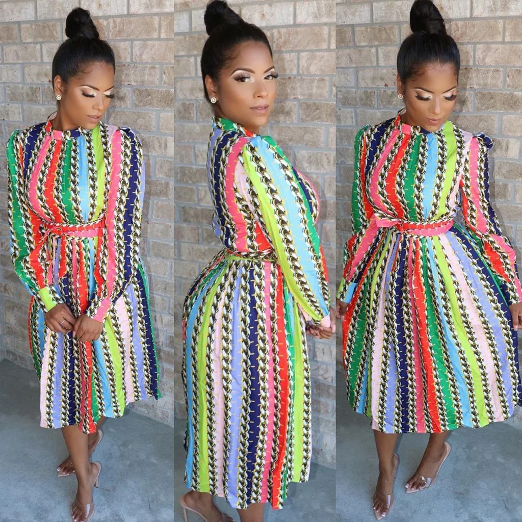 Женские платья с длинными рукавами и принтом, с поясом на талии, с круглым вырезом, цвета радуги, африканская Женская мода, весенние плиссированные платья, большие размеры