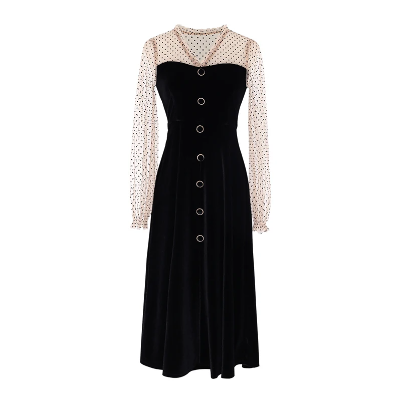 Сексуальное Кружевное лоскутное женское платье с v-образным вырезом в черный горошек на пуговицах, облегающие вечерние платья с рюшами на р...