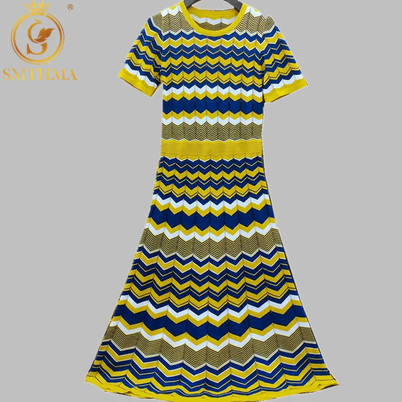 Женское трикотажное платье, длинное тонкое платье-свитер в цветную волнистую полоску с коротким рукавом, лето 2019