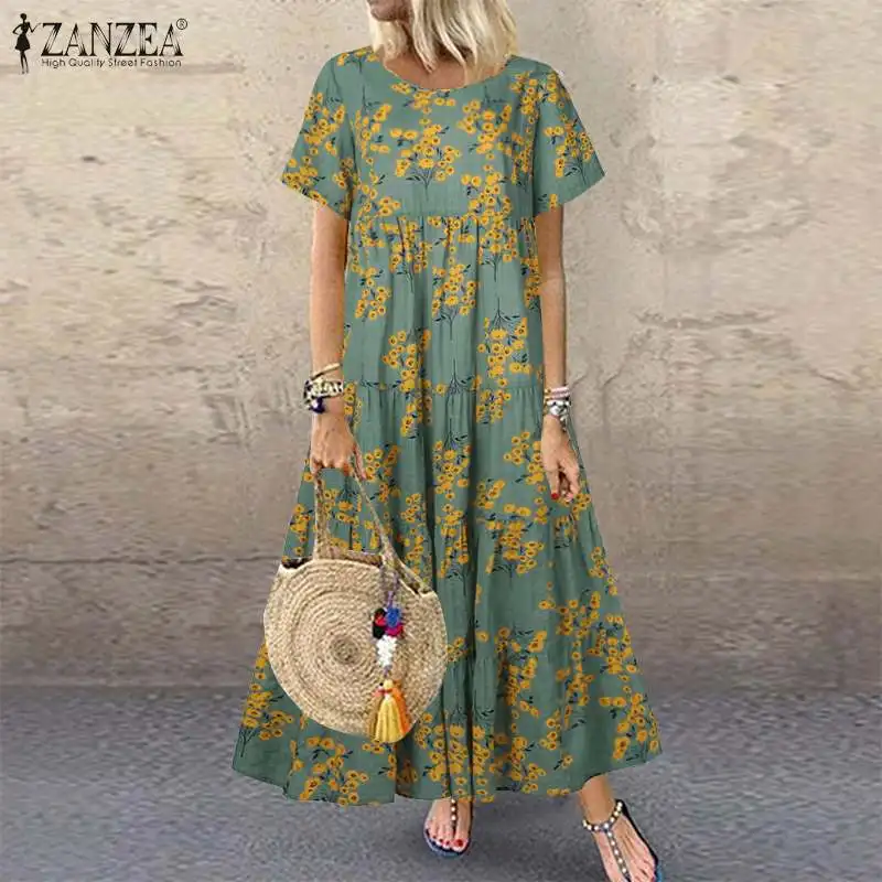 ZANZEA Лето 2019 для женщин длинные Повседневное платье макси свободные O средства ухода за кожей шеи короткий рукав полосатый Винтаж Ботильоны ...