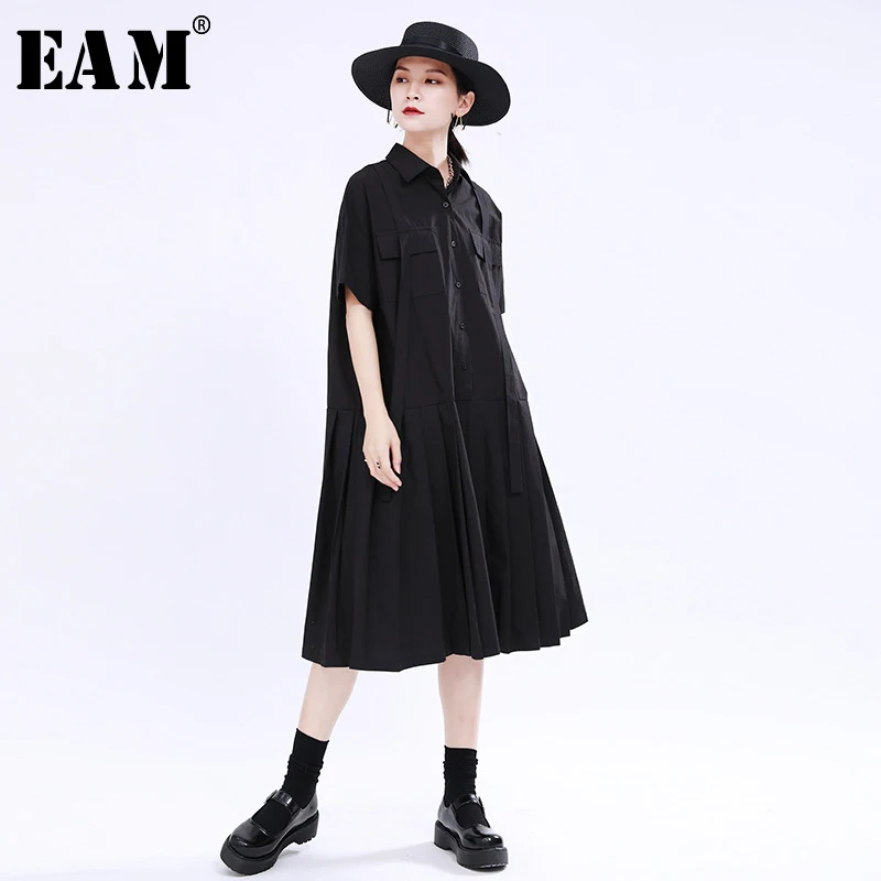 Женское платье-рубашка EAM, черное плиссированное платье большого размера с коротким рукавом и отложным воротником, весенне-летняя мода 2020 1U503