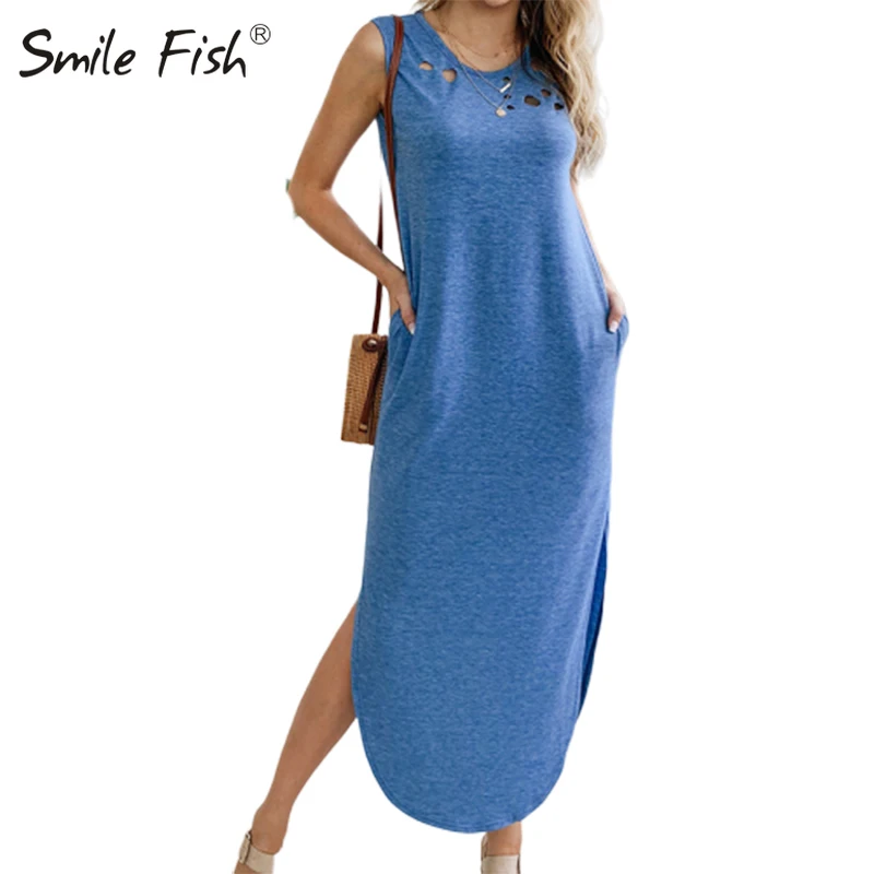 2019 модные женские платья Casaul Irrgular сплит длинное платье без рукавов майка карманы отверстия свободное летнее платье Femme верхняя одежда GV503