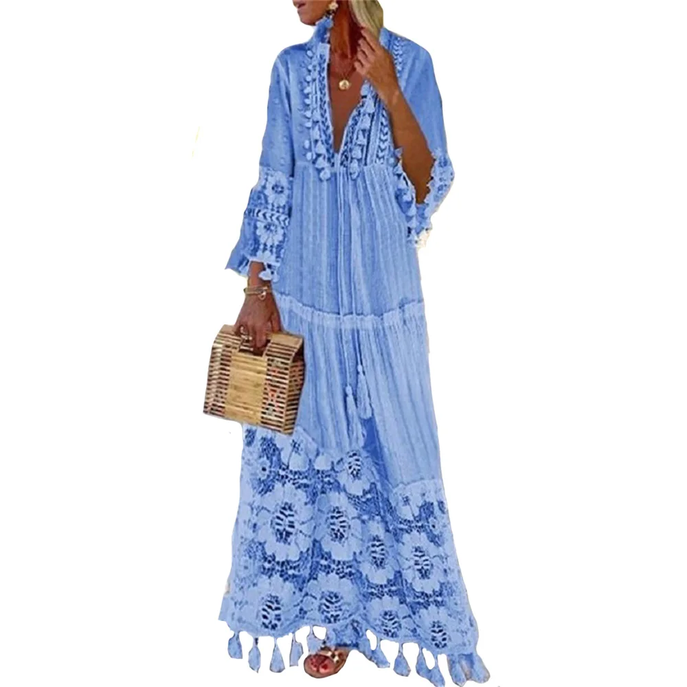 Женское однотонное платье с кружевами и кисточками, длинное платье с v-образным вырезом на весну и лето, богемное пляжное платье для отдыха