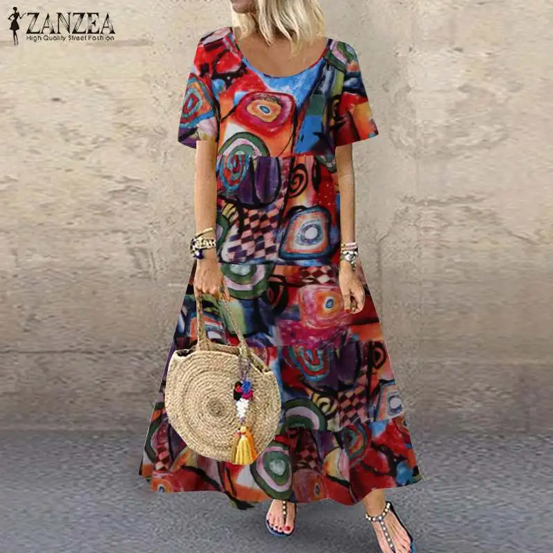 M 5XL 2020 летнее богемное Платье с принтом винтажный праздничный сарафан ZANZEA женское длинное платье с коротким рукавом Vestidos женский халат туника
