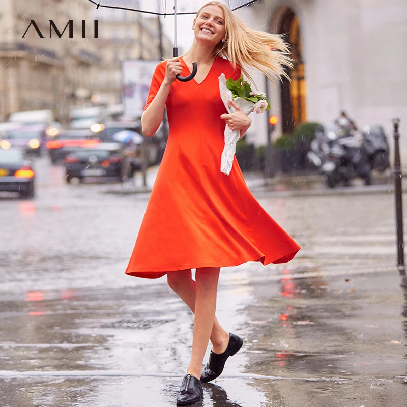 Amii минималистский платье трапециевидной формы для женщин сезон: весна-лето Новинка 2019 года повседневные короткий рукав V образным вырезо
