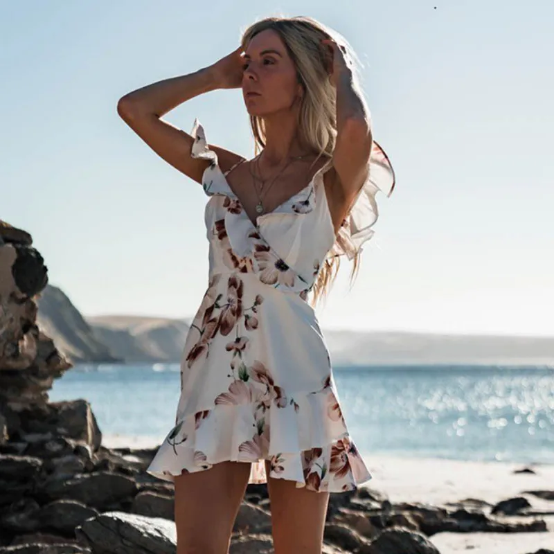 Летнее цветочное пляжное платье с бретельками и оборками, с открытой спиной, ТРАПЕЦИЕВИДНОЕ мини-платье, женское повседневное праздничное ...