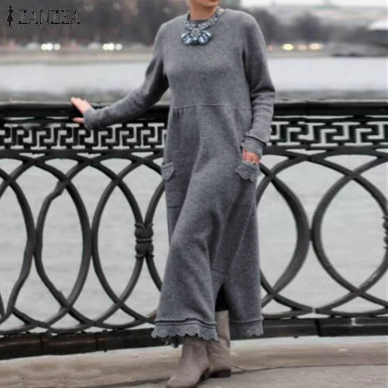 Женский кружевной сарафан в стиле пэчворк, ZANZEA, осенние толстовки, платье, повседневное, винтажное, одноцветное, с длинным рукавом, макси, ...