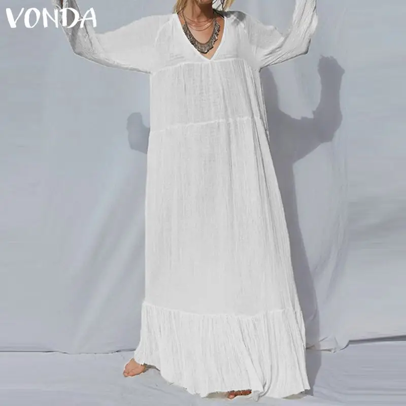 VONDA женское белое платье макси плюс размер 2019 весеннее винтажное повседневное Свободное платье с v-образным вырезом однотонное богемное чер...