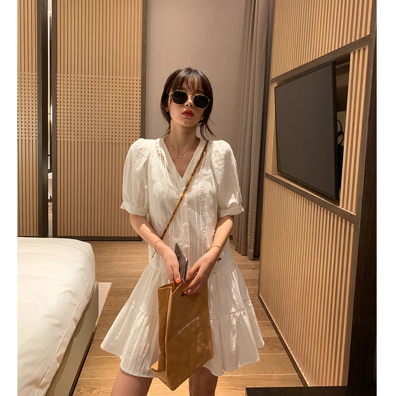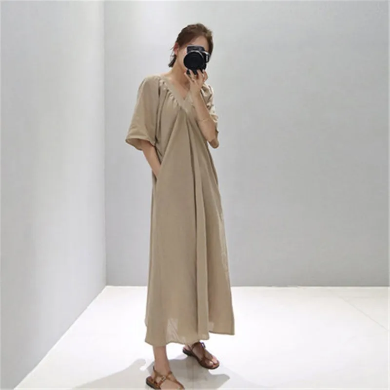 Новинка 2020, винтажная льняная Летняя женская одежда, платья с v-образным вырезом и коротким рукавом, свободное одноцветное женское платье