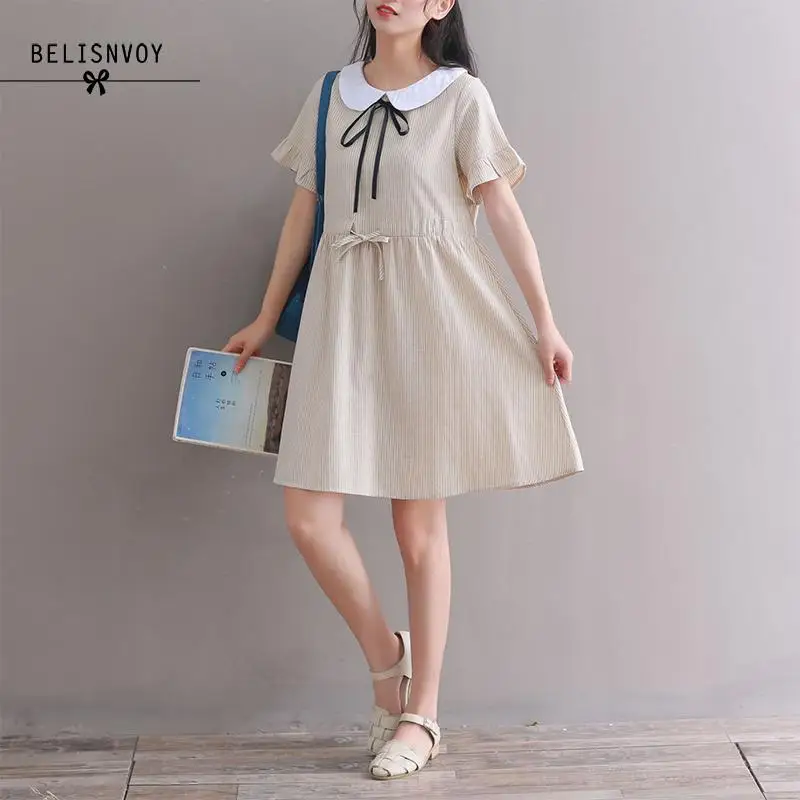 2020 Японский Элегантный дизайн летнее женское мини-платье Питер Пэн воротник хаки синий струнный женский халат хлопок лен Kawaii студенческий