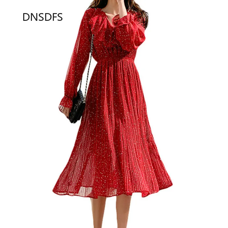 Новинка 2020, Весенняя Женская туника, вечерние платья в горошек, длинное платье, Милая Фея, длинное Плиссированное шифоновое платье с гофрированным воротником, красное, белое