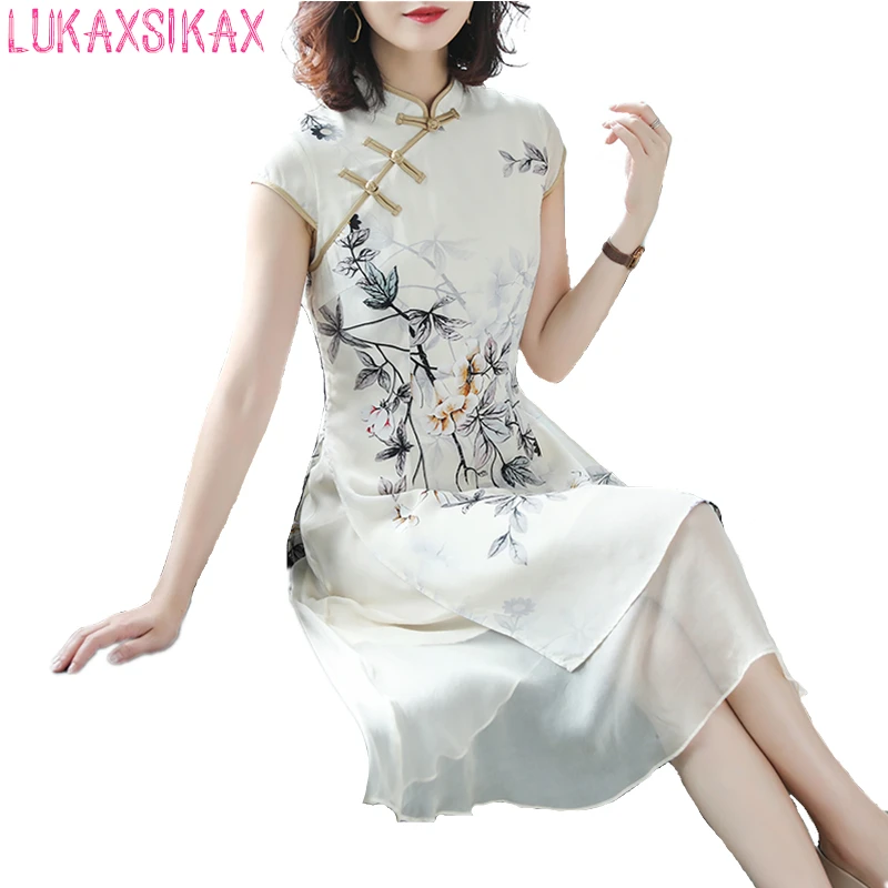 Новинка 2020, женское летнее платье, высокое качество, шелковое платье тутового шелкопряда, китайский стиль, ретро принт, улучшенное платье чонсам