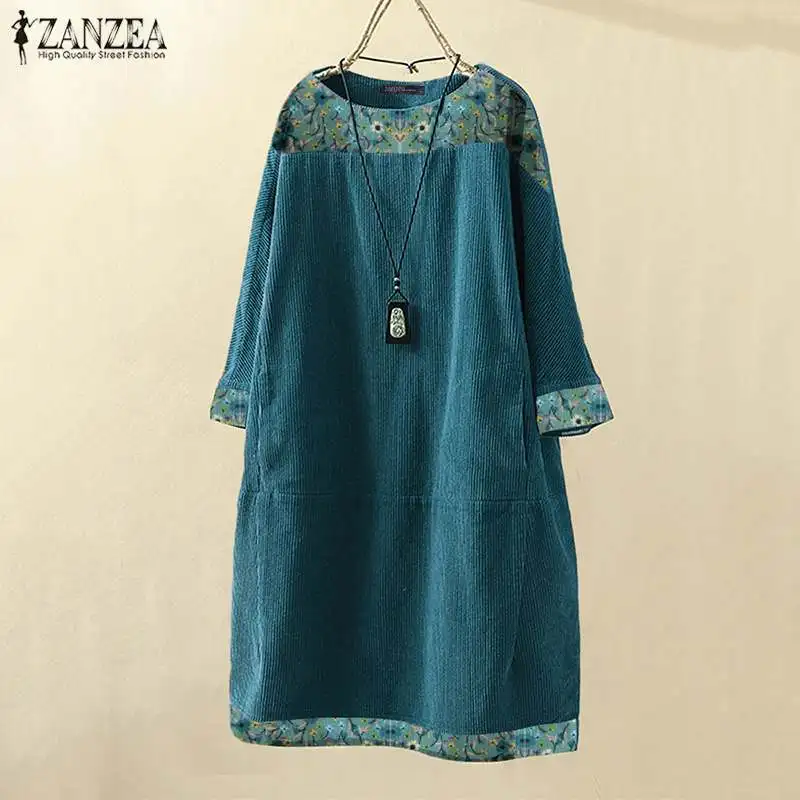 Винтажное осеннее вельветовое платье ZANZEA женщин цветочный принт длинный рукав сарафан повседневные свободные длинные топы Blusas длина до ко...