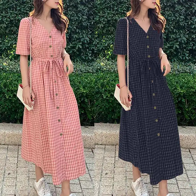 Модное женское клетчатое платье с v-образным вырезом и коротким рукавом, ZANZEA, летняя элегантная женская длинная рубашка, платье для работы, сарафан размера плюс