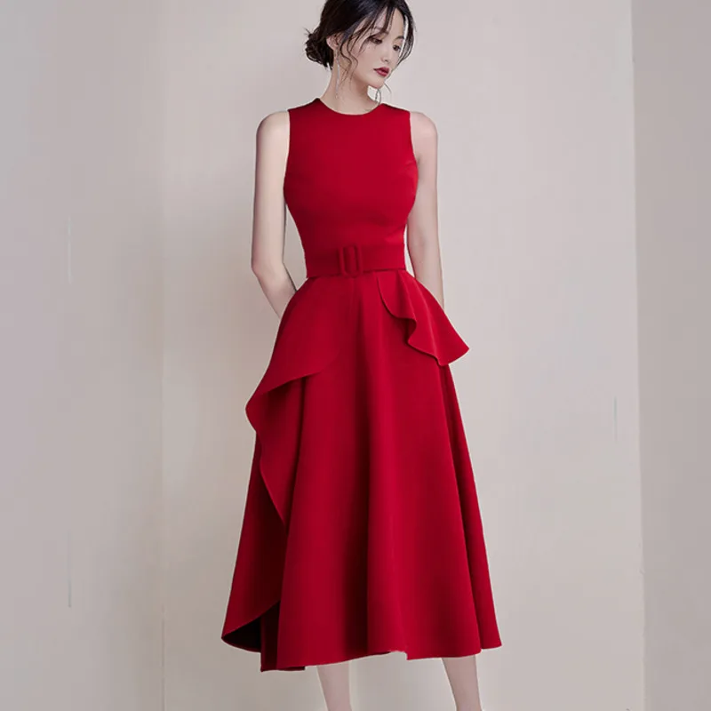2020 летнее приталенное платье трапециевидной формы с оборками и поясом с высокой талией, женское платье без рукавов, красное вечернее платье до середины икры, Vestidos De Verano