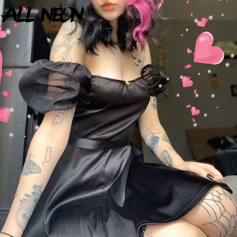 ALLNeon, винтажное Сетчатое мини-платье с пышными рукавами и открытыми плечами, женское атласное мини-платье трапециевидной формы в стиле Лолиты, стильное черное шикарное платье для девочек