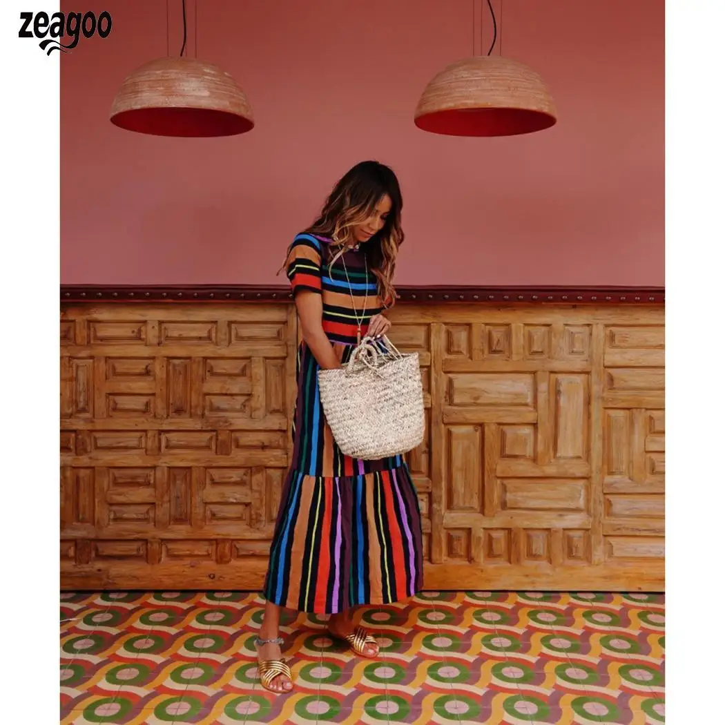 Женское Повседневное платье с круглым вырезом, коротким рукавом, в полоску, разноцветное, длина по щиколотку, Летнее Длинное свободное плат...