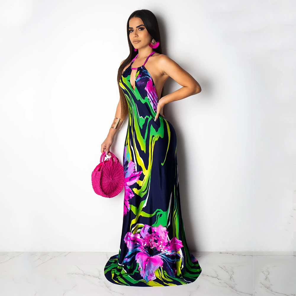 Элегантное платье макси Русалка с цветочным принтом и бретелькой на шее и открытой спиной, большие размеры, женские летние винтажные Клубны...
