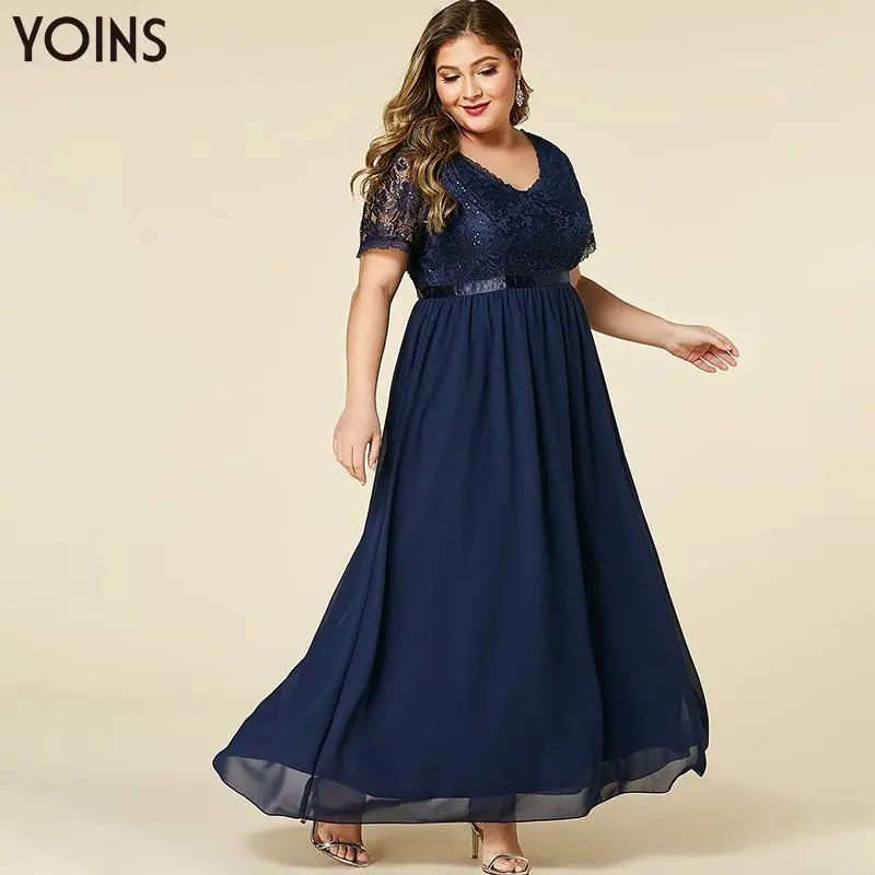 YOINS 2019 Весна Лето Женское темно-синее кружевное платье с v-образным вырезом женское элегантное Макси платье с коротким рукавом размера плюс ...
