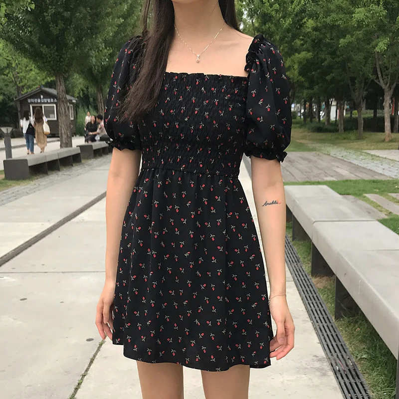 Шифоновое платье с цветочным рисунком и квадратным воротником, ТРАПЕЦИЕВИДНОЕ черное платье в стиле бохо, Vestidos Verano 2020, корейское Ретро милое платье в стиле Харадзюку